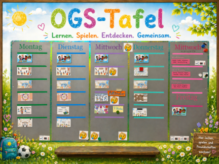 Der Plan für die ANA´s ist den Kindern frei zugänglich und hängt vor dem Eingang der Mensa. Den Tagen zugeordnete Farben und selbsterklärende Bilder unterstützen auch Kinder ,die das Lesen erst noch lernen, sich einen Überblick verschaffen zu können.